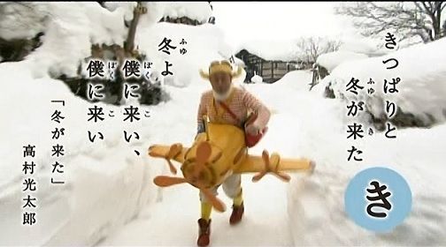 2歳から小学校低学年くらいの子どもと親を対象に制作。番組を通して、日本語の豊かな表現に慣れ親しみ、楽しく遊びながら“日本語感覚”を身につけてもらうことをねらいとしている。今回は、僕の前に道はない 僕の後ろに道は出来る「道程」高村光太郎、ひこうきさんようしゅんしゅん旬~冬~/ゆきおとこ、うた/スキー、道程。