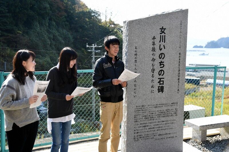 宮城県女川町には、津波発生時の避難の目安とするため「女川いのちの石碑」が沿岸部の21カ所に建立されている。2011年の東日本大震災。同町の津波による死者・行方不明者は827人に及んだ。当時小学6年生だった地元の子どもたちが、中学入学後「1000年後まで津波から命を守りたい」と考えた▲地元と連携して寄付を募り、津波の到達点を参考に建て続け、21年に完了した。国土地理院によると、東日本大震災の教訓を伝える自然災害伝承碑は、全国で130カ所が地図に載る▲あれほど苛烈だった津波被害も発災から約15年を経て、知らない世代の人が増えてくる。宮城県石巻市在住の藤間千尋さん(47)は、公益社団法人「3・11メモリアルネットワーク」(同市)のスタッフとして伝承活動に取り組む。「『津波を知らない子どもたち』を嘆くよりも、伝わる言葉を持っていない大人側の課題だと考えるべきです」と指摘する▲藤間さんは横浜市出身。震災後に石巻でボランティア活動を行い、移り住んだ。震災遺構などで見学者に説明する際は、自身は被災者でないことを事前に伝える。「伝承する役割を体験者だけに背負わせず、分かち合えれば」と語る▲語り部の活動、伝承碑、震災遺構の保存。共通の目的は未来の犠牲者を一人でも減らすことにある▲藤間さんが所属する同団体は、被災者でなくても関心を持つ大学生らが、震災遺構などでガイド役となる取り組みを始めた。多様な伝承のあり方を考えたい。建立当時の「女川いのちの石碑」のひとつ。女川中学校の卒業生が碑文について説明した=宮城県女川町出島で2015年10月31日