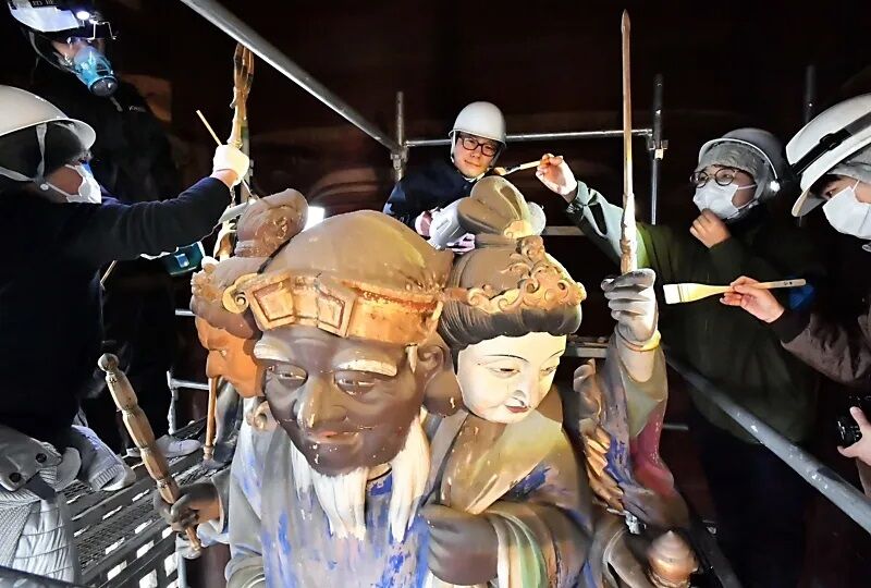 この日は文化財修復を専門とする藤白彫刻研究所(東京都)の藤曲隆哉代表(43)=東京都=ら5人が三面大黒天像の清掃を進めた。高さ約3・5メートルある像の周辺に組んだ足場を使い、像の頭を黒く染めたほこりを丁寧に払った。