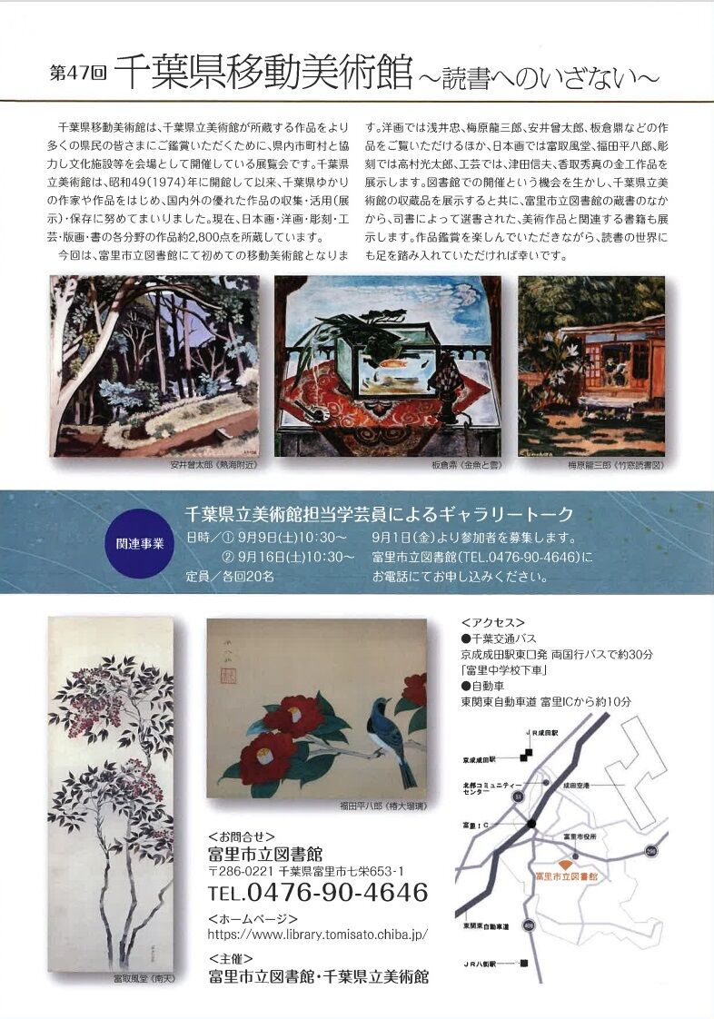 千葉県移動美術館は、千葉県立美術館が所蔵する作品をより多くの県民の皆さまにご鑑賞いただくために、県内市町村と協力し文化施設等を会場として開催している展覧会です。成田市では、これまで過去4回開催しており、今回の第49回移動美術館は5回目の開催となります。本展では、三里塚を詩に歌った高村光太郎による彫刻作品《手》や、成田空港にちなみ、板倉鼎や鶴田吾郎をはじめ海外を旅した画家たちの風景画からみる「異国への旅」など、成田市と千葉県立美術館にまつわる5つのセクションで、それぞれのテーマに合わせたコレクションを約50点ご紹介いたします。また成田市ゆかりの作家、篠﨑輝夫を特集いたします。